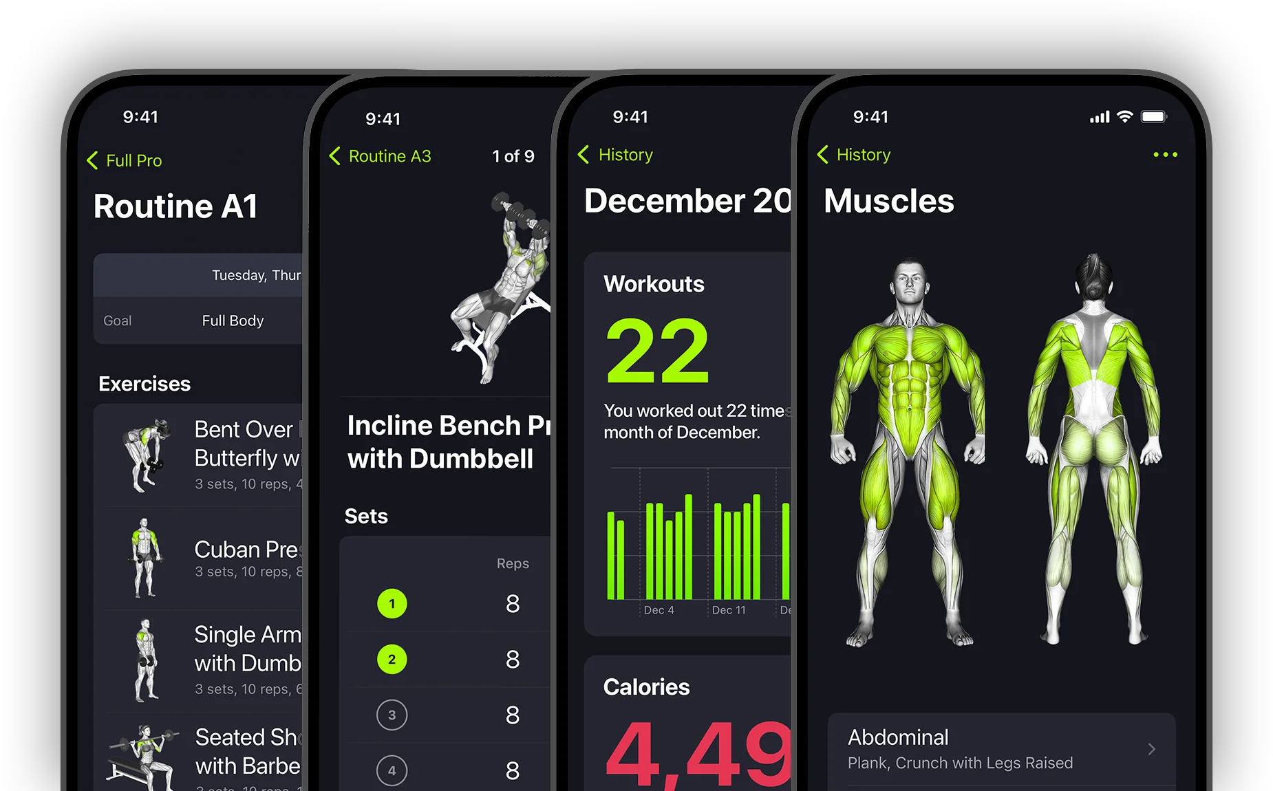 Volume lifted, personal records, calories burned, muscle group breakdowns. All in charts that actually make sense. Open the app and see your progress at a glance.