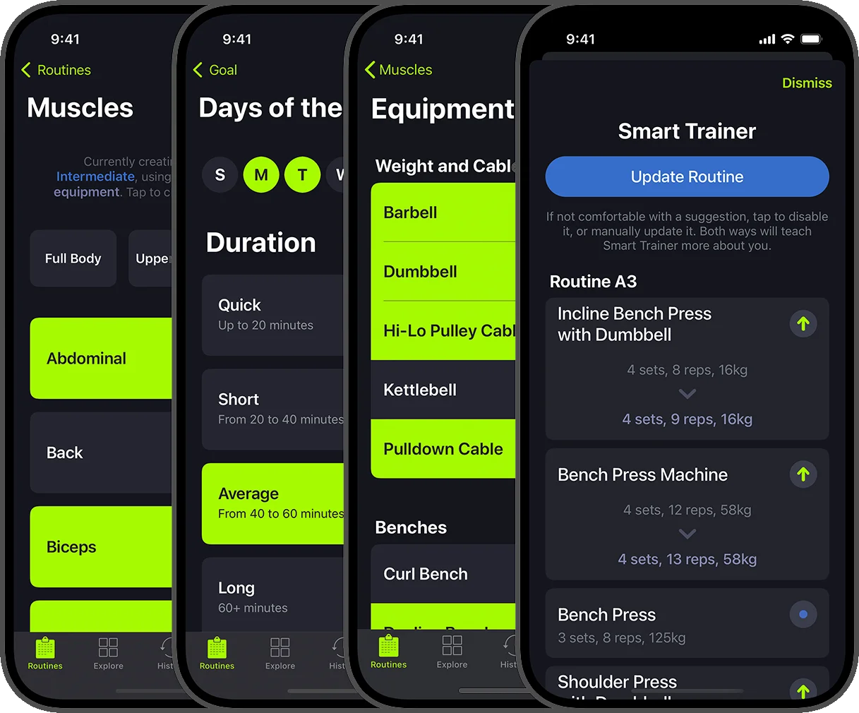 Smart Trainer analyzes your workout history, tracks your progression curves, and knows when to push you harder or scale things back. It understands muscle group recovery, training volume, and progressive overload so you don't have to.